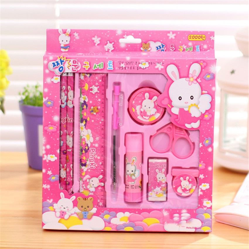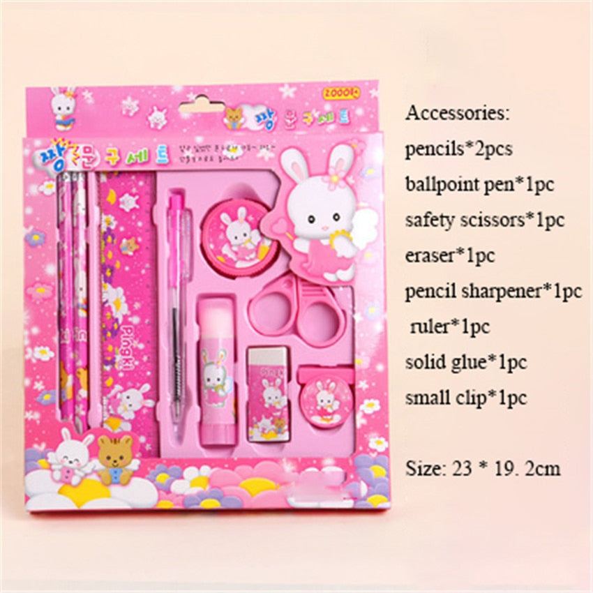 Juego de papelería Kawaii de 9 piezas: lápiz, tijeras, borrador, bolígrafo, pegamento, regla, juego de papelería.