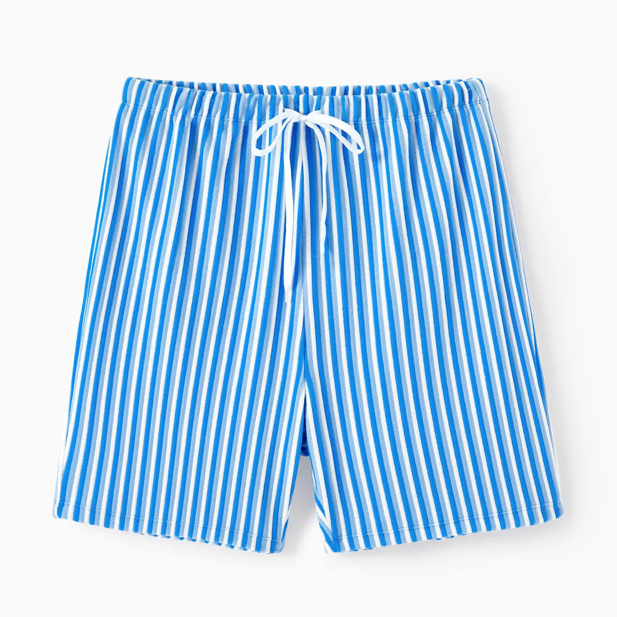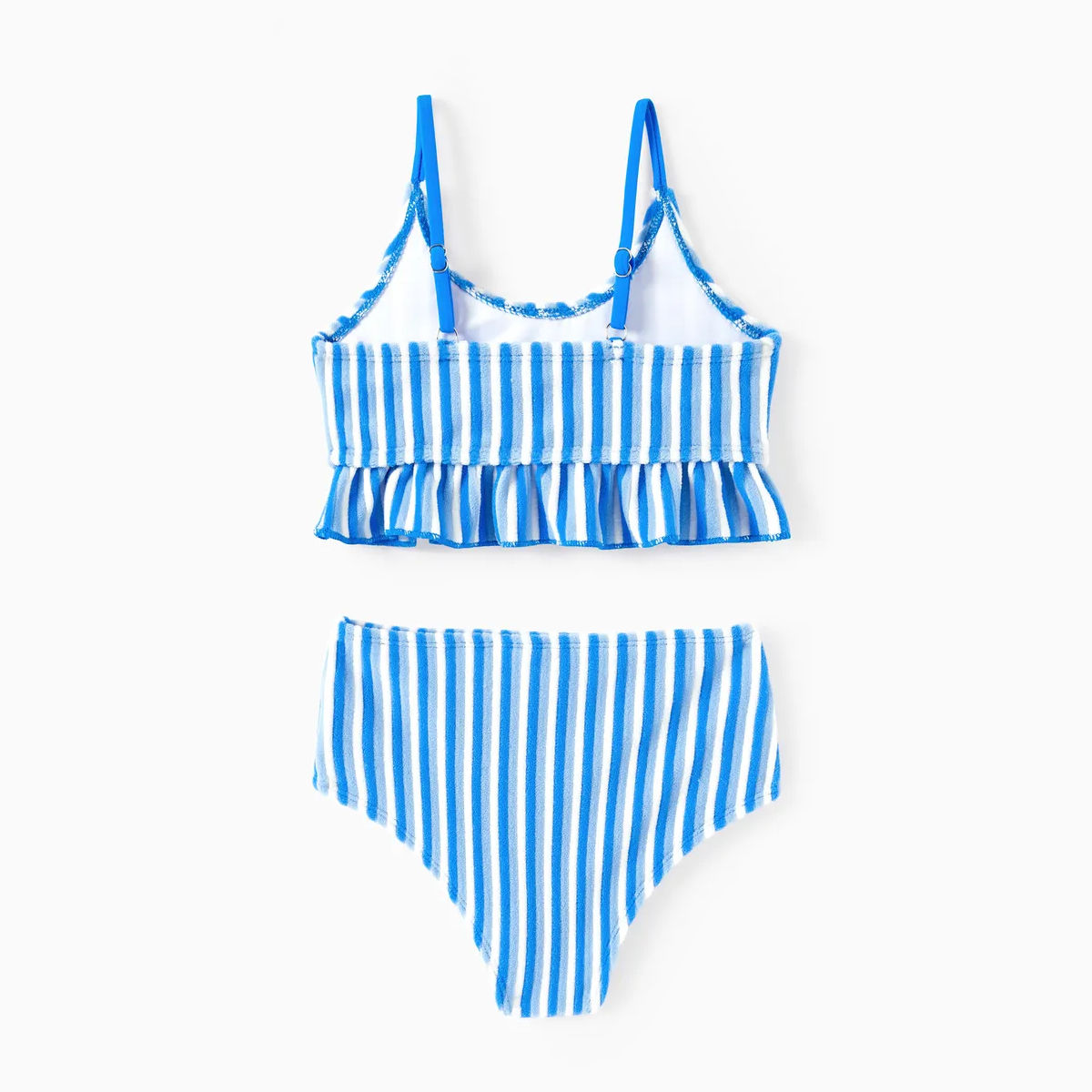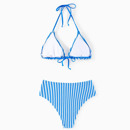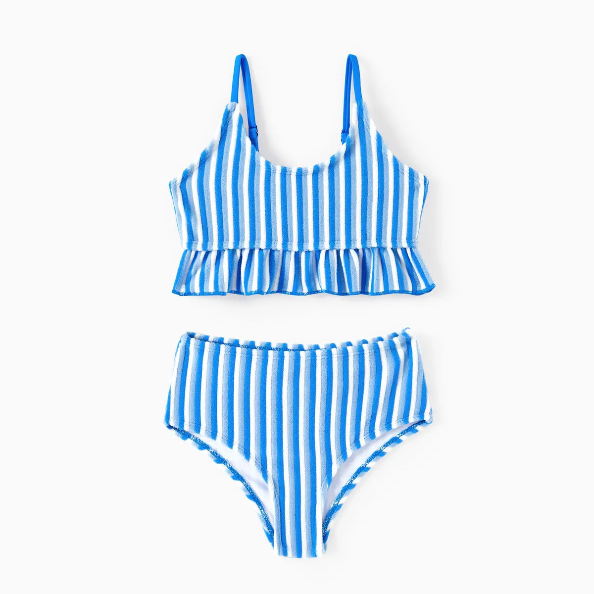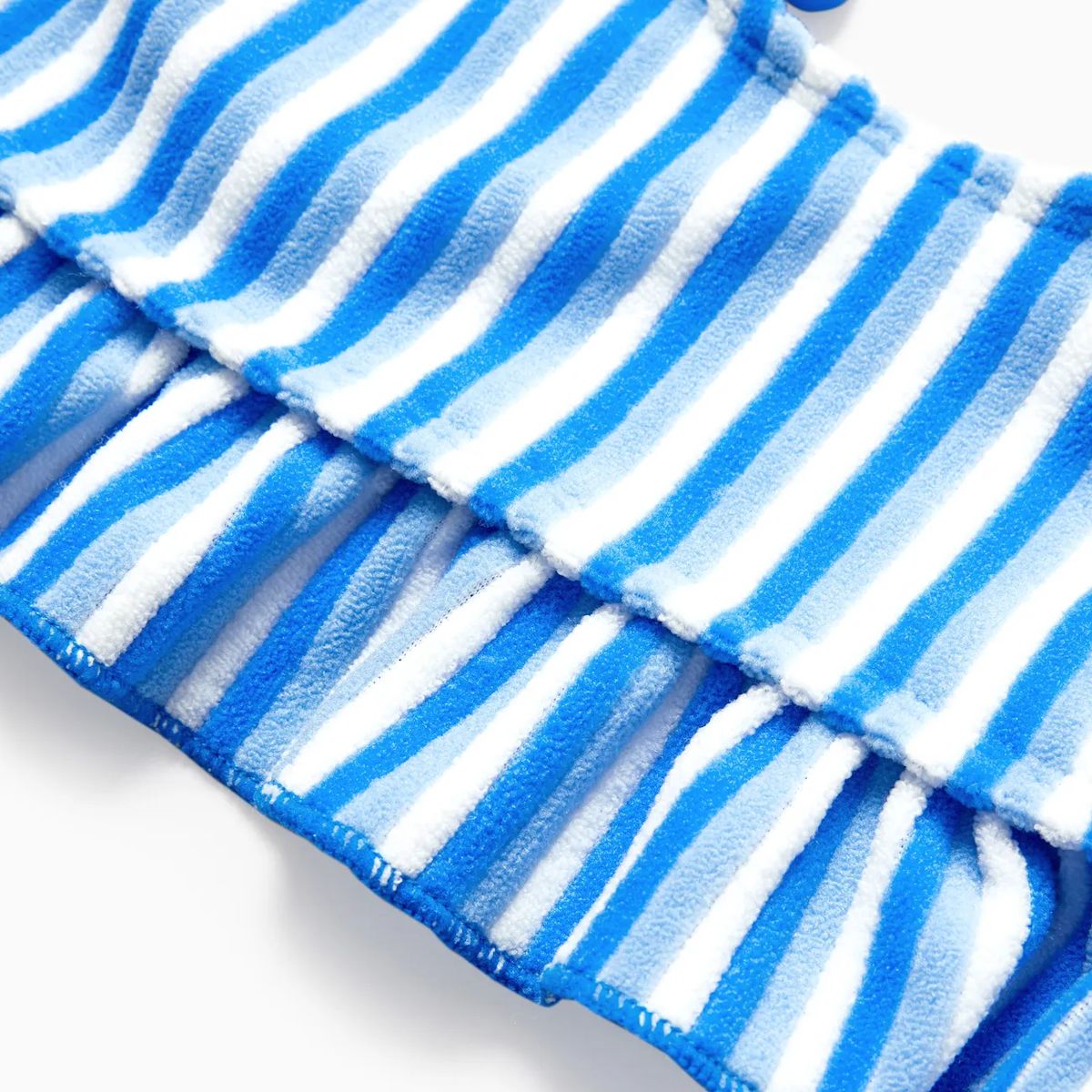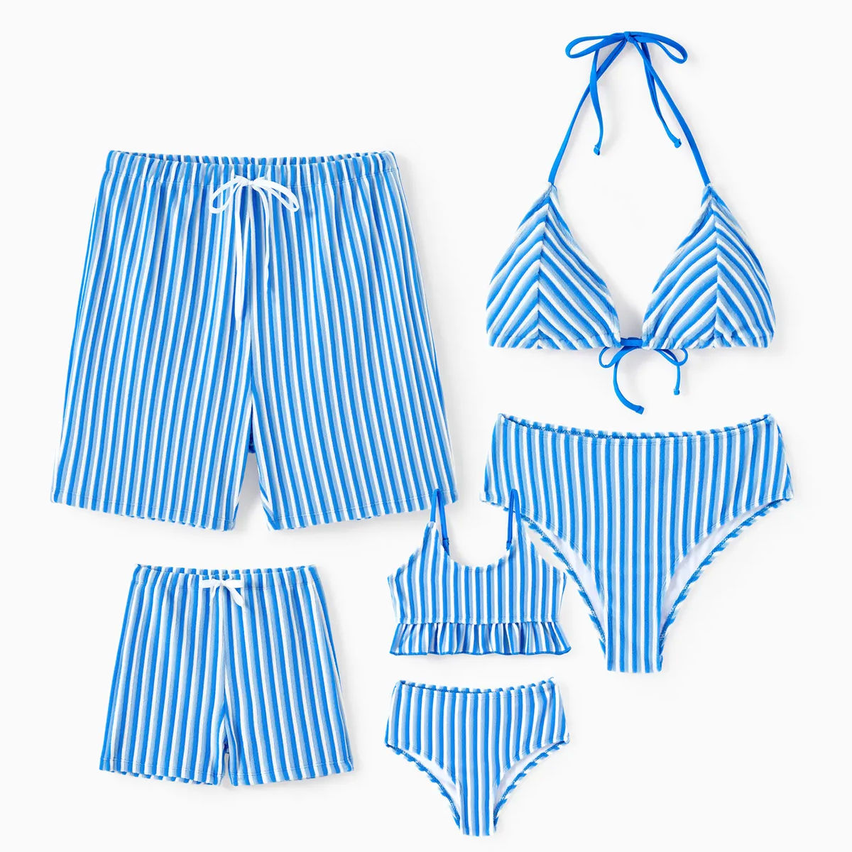 Nombre del artículo: Conjunto de bikini triangular a rayas azules con cuello halter, traje de baño familiar a juego con toalla y bañador a rayas. Tipo de producto: Conjuntos familiares a juego; Trajes de baño familiares a juego; Categoría de producto:Trajes de baño familiares a juego > Trajes de baño familiares a juego ; Material: poliéster; Color: Azul, Blanco; Detalles: Conjunto de bikini triangular de rayas azules para mujer, traje de baño de dos piezas con cuello halter; Traje de baño de dos piezas con volantes y rayas azules para niñas, de talle alto; Bañador con cordón y rayas azules a juego para padre e hijo; Estilo Patrón: Azul, Rayado, Azul claro, Triángulo, Cuello halter, Traje de baño de toalla a juego familiar, Volantes, Cordón, Bañador, Almohadilla extraíble, Verano, Orilla del mar, Playa, Piscina, Aguas termales, Spa, Ambiente de vacaciones; Temporada: Verano;