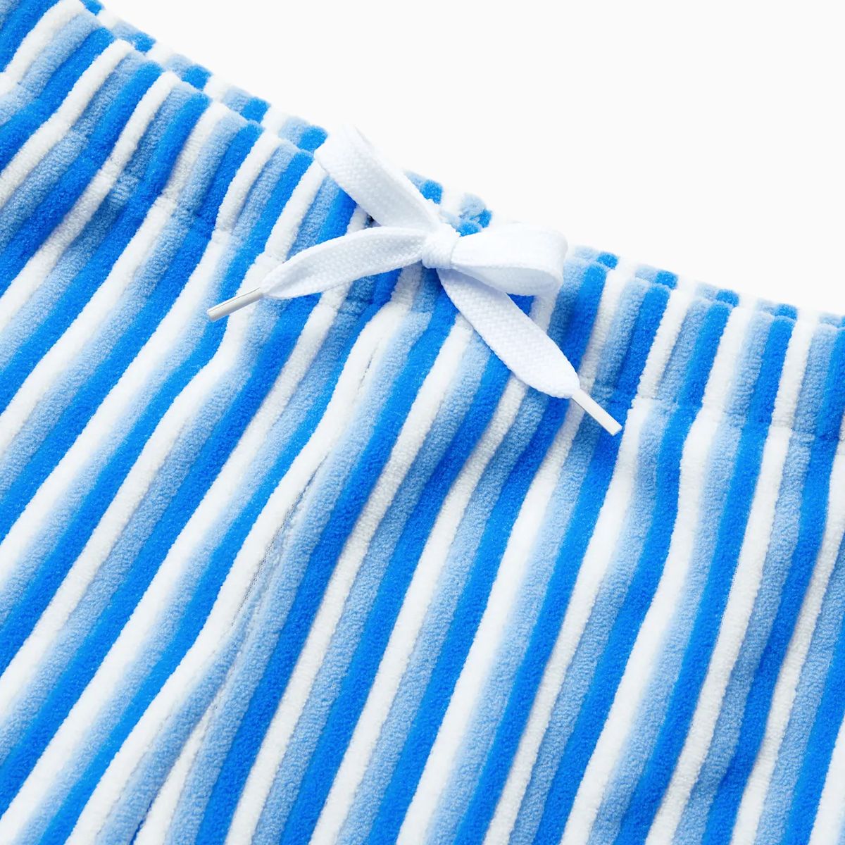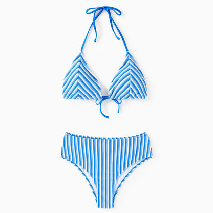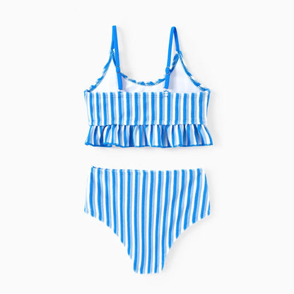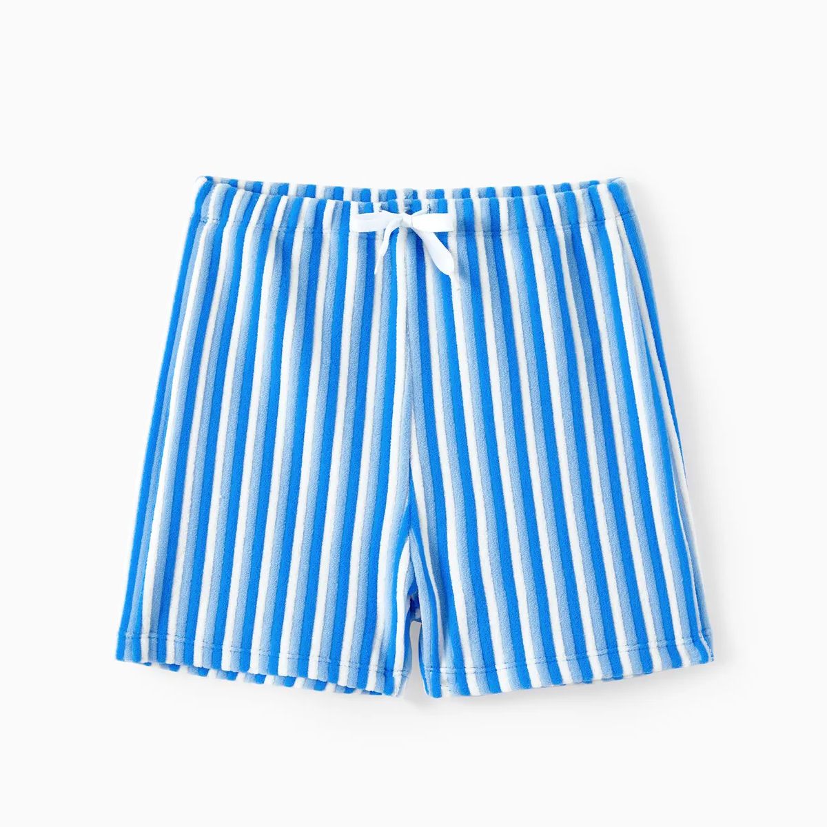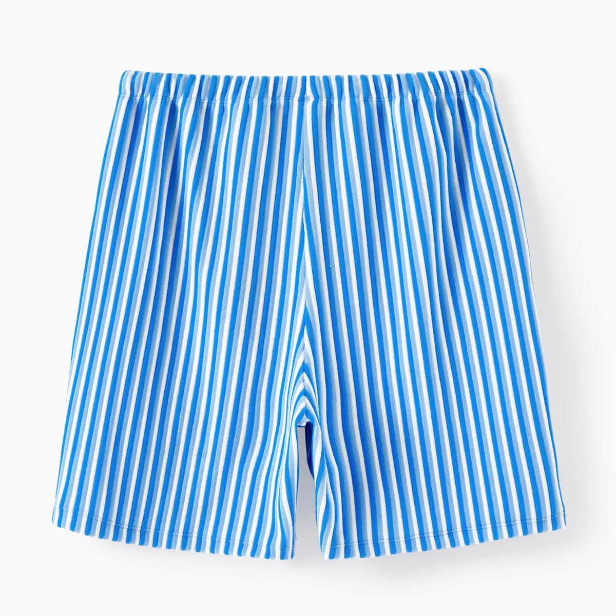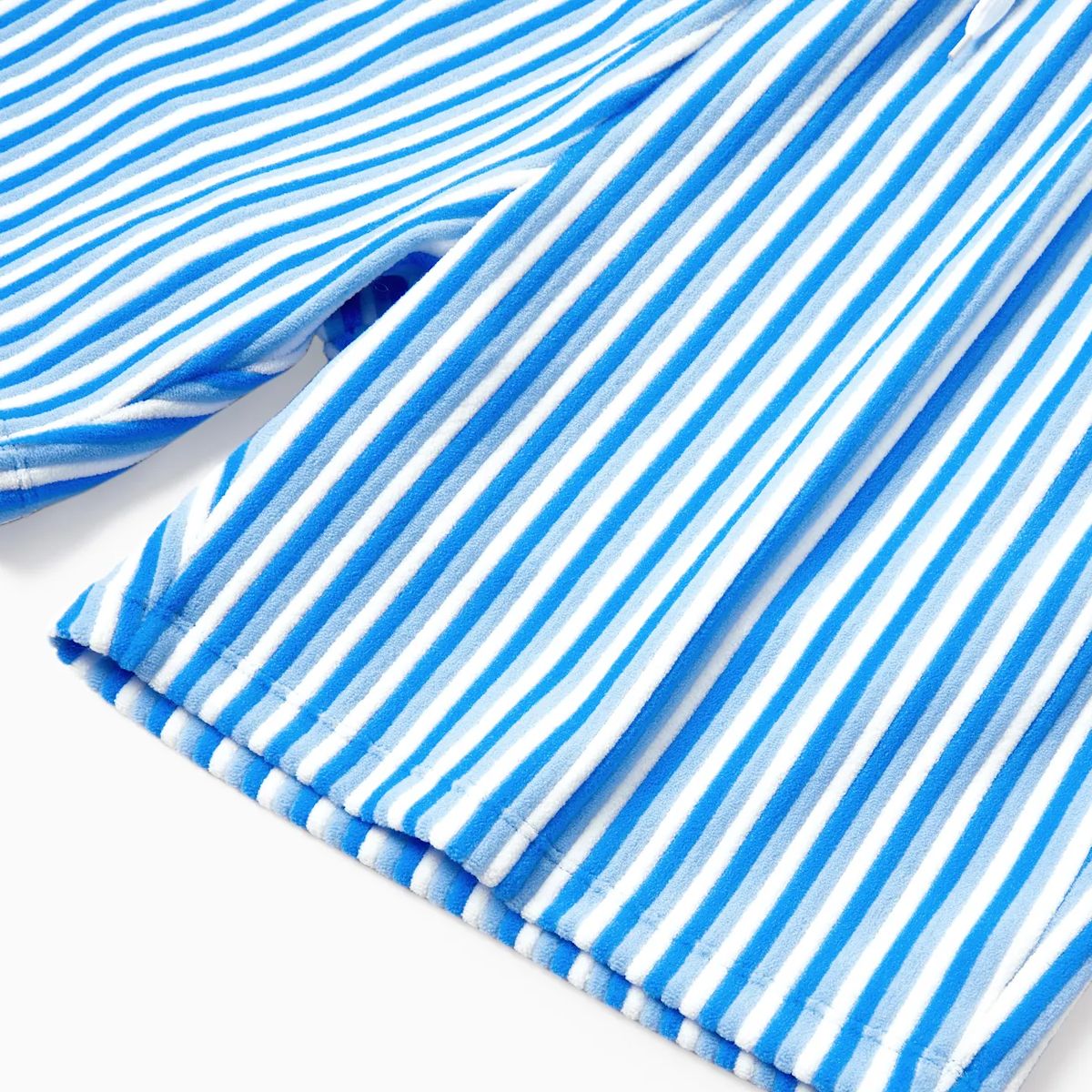 Nombre del artículo: Conjunto de bikini triangular a rayas azules con cuello halter, traje de baño familiar a juego con toalla y bañador a rayas. Tipo de producto: Conjuntos familiares a juego; Trajes de baño familiares a juego; Categoría de producto:Trajes de baño familiares a juego > Trajes de baño familiares a juego ; Material: poliéster; Color: Azul, Blanco; Detalles: Conjunto de bikini triangular de rayas azules para mujer, traje de baño de dos piezas con cuello halter; Traje de baño de dos piezas con volantes y rayas azules para niñas, de talle alto; Bañador con cordón y rayas azules a juego para padre e hijo; Estilo Patrón: Azul, Rayado, Azul claro, Triángulo, Cuello halter, Traje de baño de toalla a juego familiar, Volantes, Cordón, Bañador, Almohadilla extraíble, Verano, Orilla del mar, Playa, Piscina, Aguas termales, Spa, Ambiente de vacaciones; Temporada: Verano;