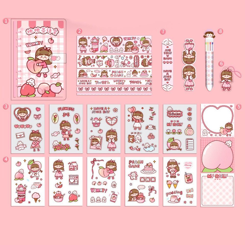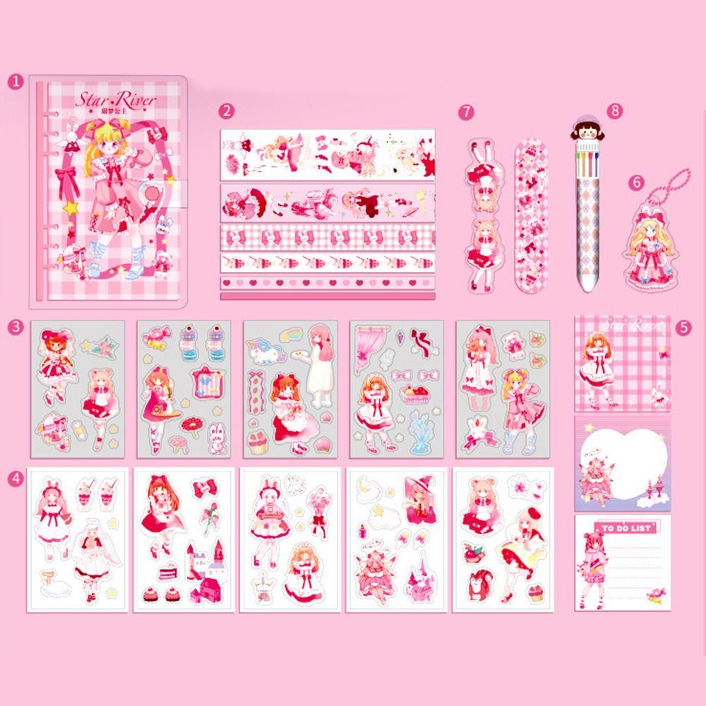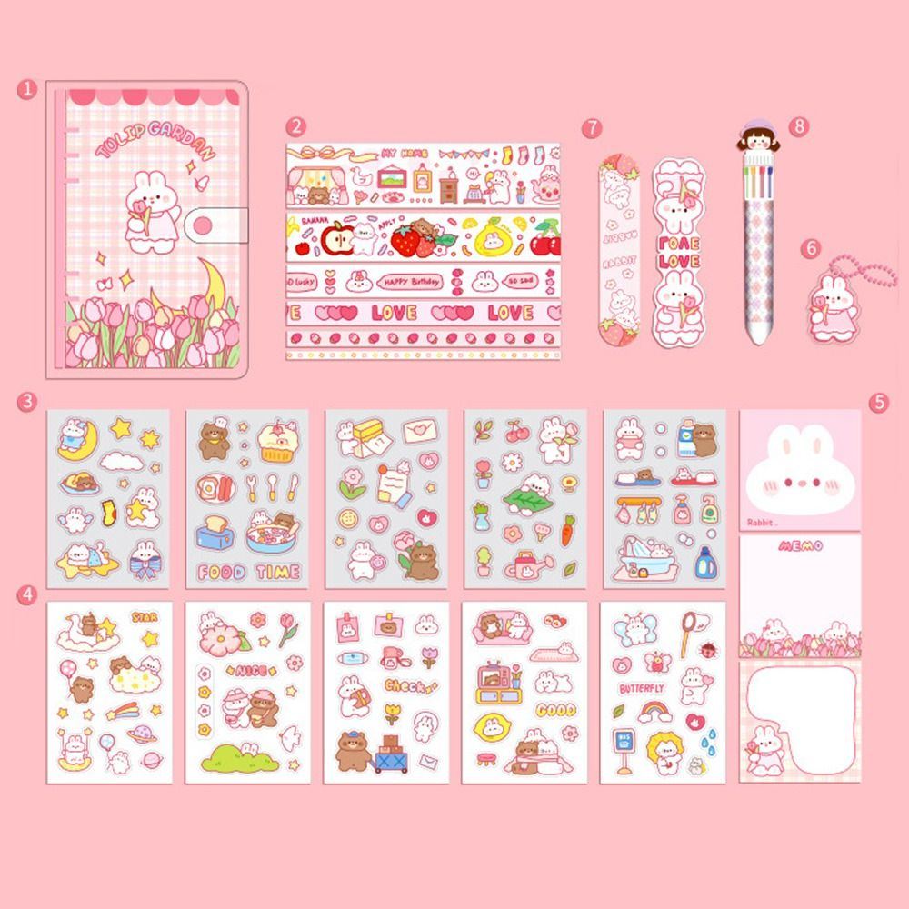 Juego de papelería kawaii con cinta washi de dibujos animados, cuaderno, marcador y bolígrafo.