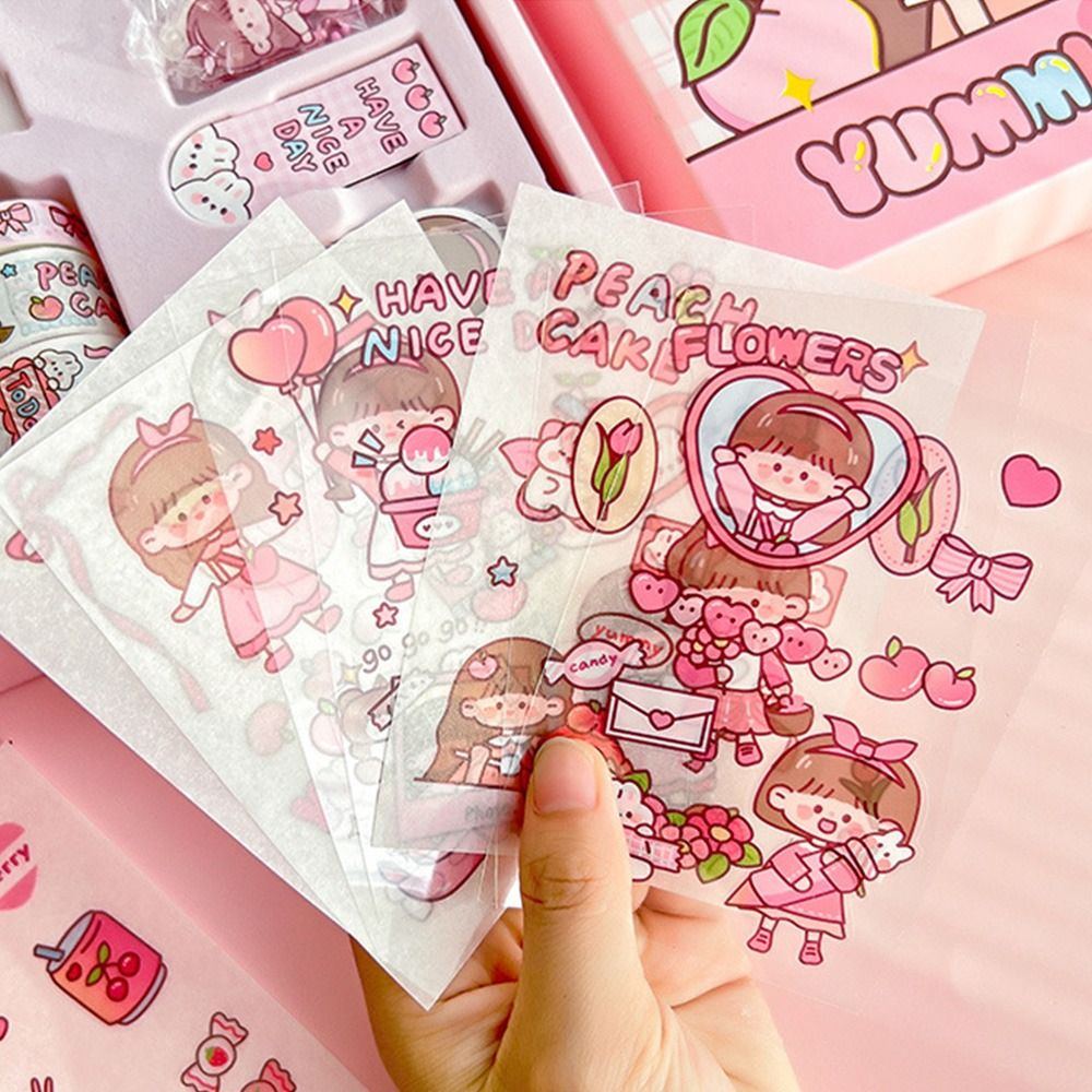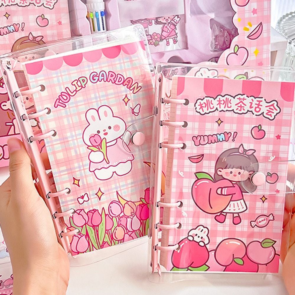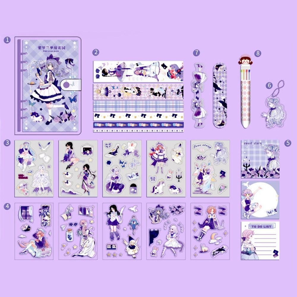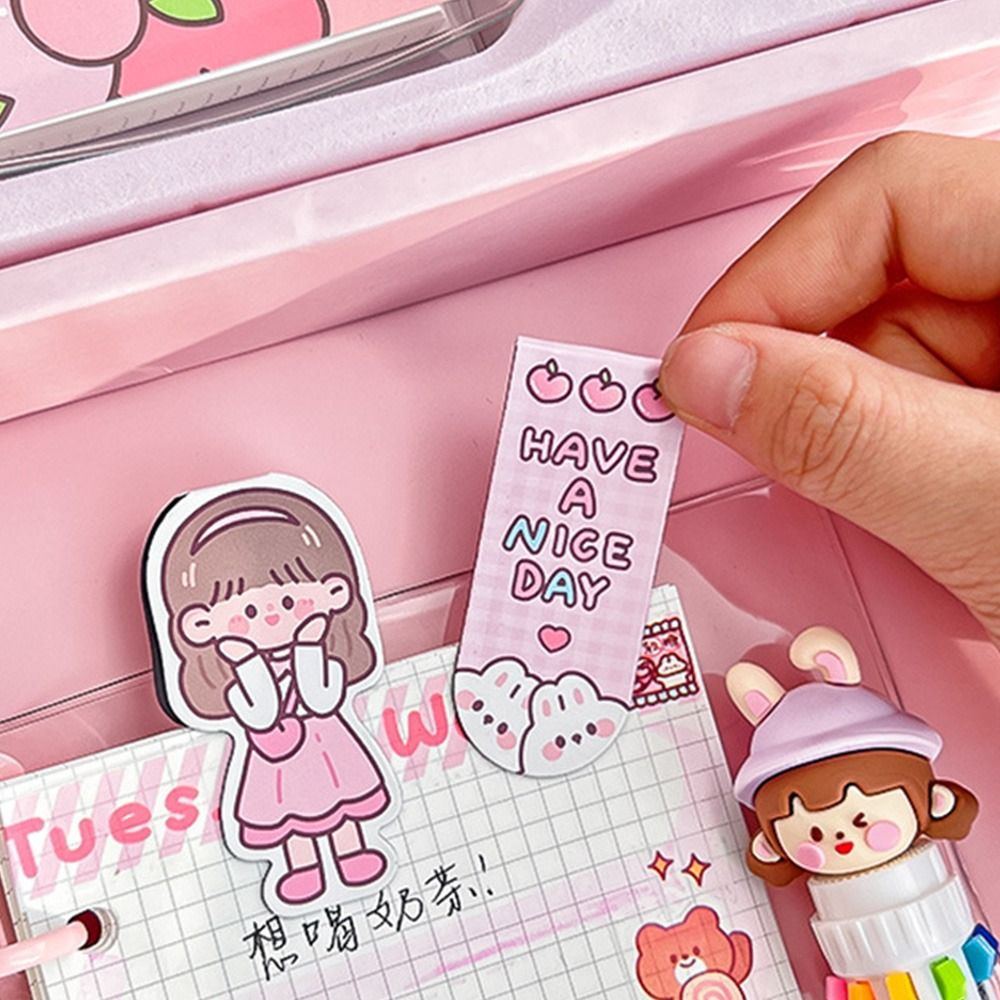 Juego de papelería kawaii con cinta washi de dibujos animados, cuaderno, marcador y bolígrafo.