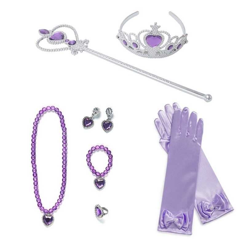 Paquete 4: Disfraz de Rapunzel + Tiara + Varita + Guantes + Conjunto de Joyas (Collar*1; Pulsera*1; Anillo*1; Pendientes*1 Par;)