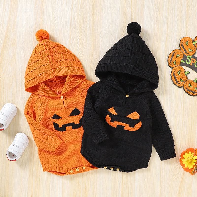 Knitted Halloween Baby Hoodie Pumpkin Long-sleeve Sweater Romper